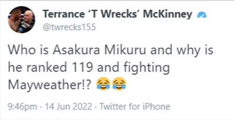 UFCライト級プロスペクトのテレンス・マッキニーは、メイウェザーが9月にRIZINで16勝3敗のMMAファイターとボクシングをするというニュースに、混乱しながらも反応した。彼はその後削除されたツイートにこう書いた。